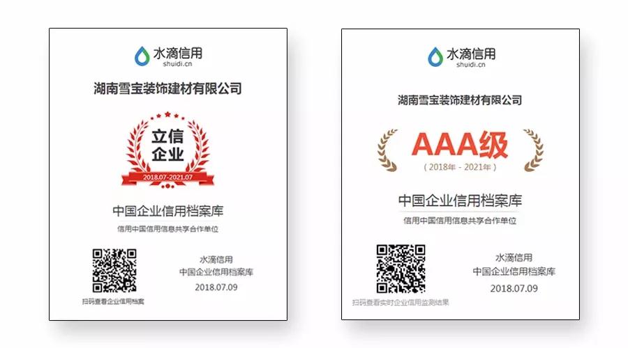 2018年7月9日,湖南雪寶裝飾建材有限公司榮獲由權(quán)威第三方評(píng)價(jià)機(jī)構(gòu)水滴信用評(píng)價(jià)中心頒發(fā)的“國(guó)家信用體系建設(shè)核心合作伙伴首批誠(chéng)信推薦企業(yè)——立信企業(yè)”和“AAA級(jí)優(yōu)秀企業(yè)信用等級(jí)證書(shū)”。