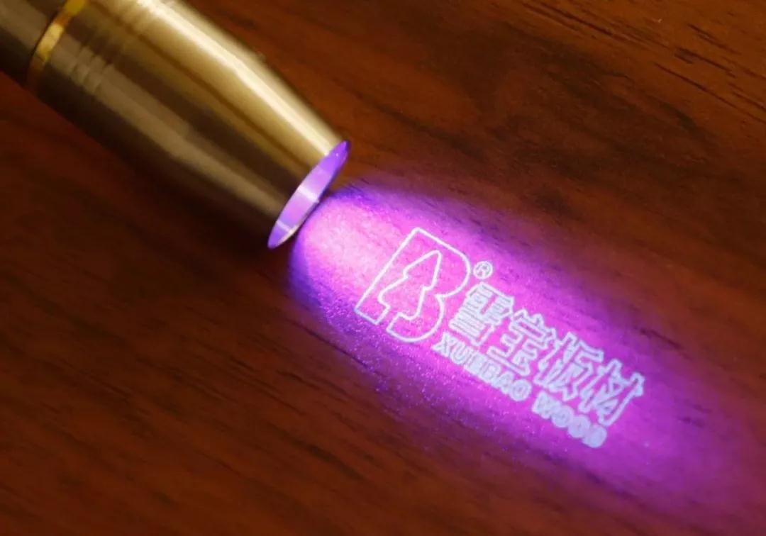 所有的雪寶板材上,都采用了這一防偽技術(shù)。識(shí)別的方法也很簡(jiǎn)單:普通的紫光燈照射到我們雪寶板材的板面,即可顯示雪寶板材LOGO字樣,示例如下: