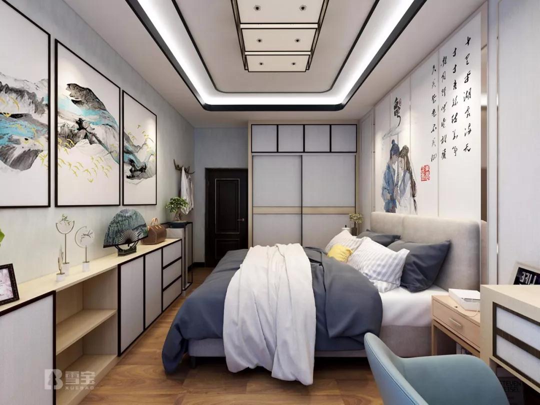 墻面上運(yùn)用墨竹裝飾,與全屋整體風(fēng)格相互襯托和統(tǒng)一。墨竹,代表了男主人堅(jiān)韌的性格和不屈的氣節(jié)。在榻榻米升降臺(tái)酌一壺香茗,與三兩好友在一方文墨書香的書室里品茗閱讀,當(dāng)屬生活一大趣事。青色瓷瓶插上幾許枯枝,一幅油畫裝飾,令空間生機(jī)勃勃。