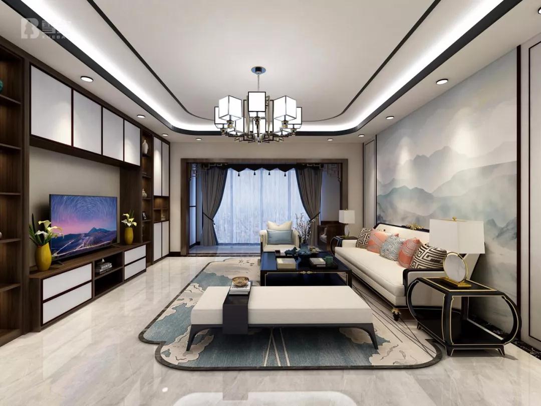 在裝飾客廳背景上,大面積的墻面上使用山水畫,象征著男主人的仁與智,以襯托家庭的書香氣息以及主人心境的闊達(dá)和格局。