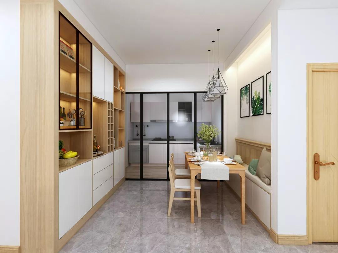 餐廳區(qū)域,金秋玉錦類似原木細密的天然紋理及其柔和的色彩,加上綠植的點綴,回歸大自然的感覺。空間利用最大化,長桌搭配帶儲物性能的卡座。充滿北歐氣息的 吊燈,光影重疊間,溫馨滿滿。