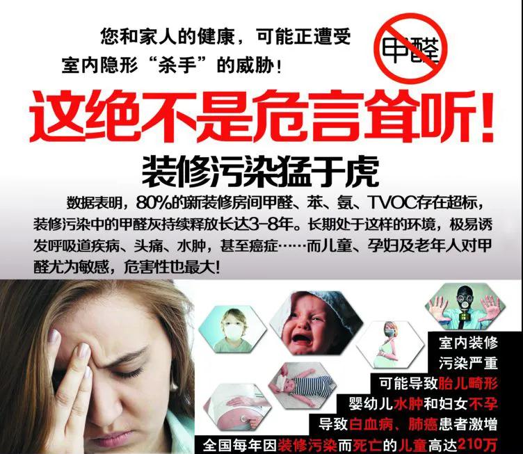 甲醛—:作為一種對(duì)人類(lèi)最有害的氣體,被譽(yù)為室內(nèi)“奪命殺手”,嚴(yán)重危害新裝修家庭,尤其是兒童、孕婦、老人的身體健康。