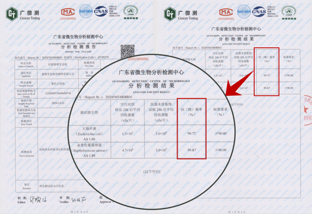 經(jīng)權(quán)威機(jī)構(gòu)檢測(cè),雪寶抗菌防霉板有害細(xì)菌有效殺菌率達(dá)99%以上;
