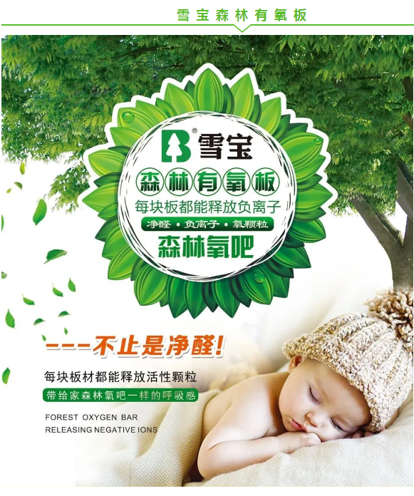 雪寶森林有氧板以環(huán)保板材為基礎(chǔ),在裝飾表面特別添加長(zhǎng)效“負(fù)氧離子”的環(huán)保板材,所產(chǎn)生的“負(fù)氧離子”,有效改善空氣中游離的有害物質(zhì),并可將甲醛分解為水分子與無(wú)毒無(wú)害的“肟”,實(shí)現(xiàn)清除室內(nèi)甲醛、凈化空氣的效果!