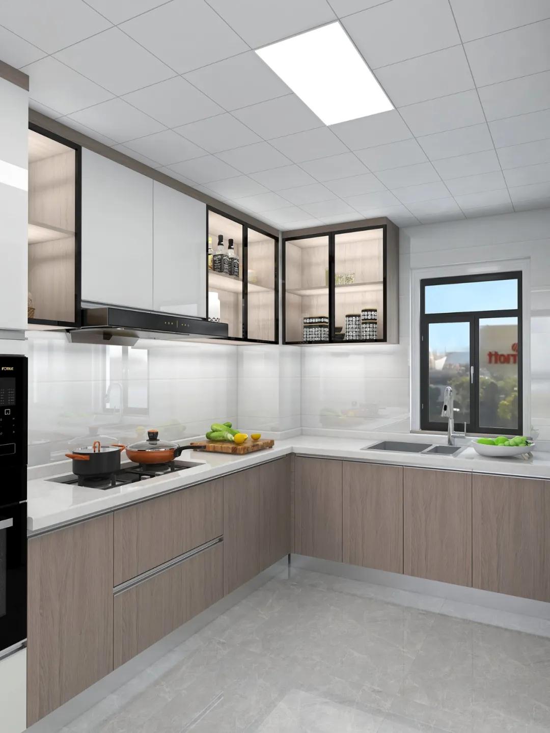 U字型地柜為廚房提供更多的收納空間,可以收納更多的廚房用品,臺面只放常用必備的物品。