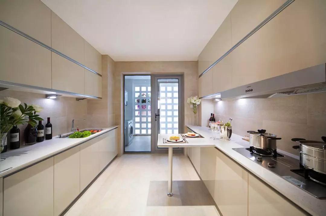 也叫雙一字型廚房,是最高效的廚房布局,最大化分配廚具和操作臺的空間,廚房長而窄,兩側(cè)都有空間,在走廊一側(cè)空間足夠的話,還可以設(shè)計(jì)一個溫馨小餐廳。