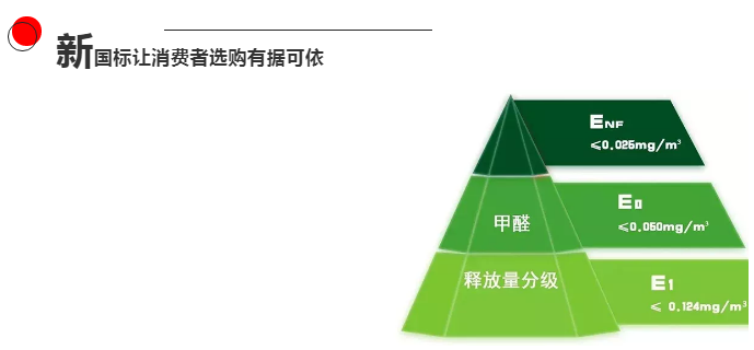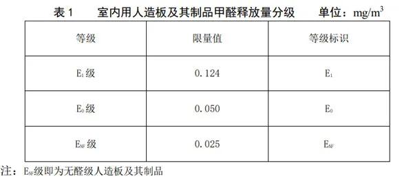 ★ 該標(biāo)準(zhǔn)將室內(nèi)用人造板及其制品的甲醛釋放量按照限量值分為3個(gè)等級(jí),即E1級(jí)(≤0.124mg/m³)、E0級(jí)(≤0.050mg/m³)和ENF級(jí)(≤0.025mg/m³)。