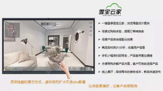 通過雪寶智慧云屏,客戶只需一鍵切換,輕輕用指尖滑動(dòng),即可隨心切換不同花色、風(fēng)格和產(chǎn)品效果圖,以沉浸式、可視化的方式呈現(xiàn)720°VR全景漫游,提升顧客體驗(yàn)感和代入感。