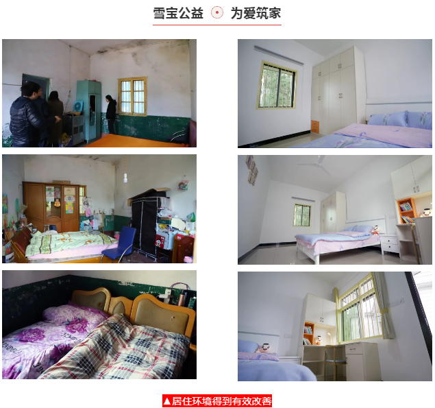 經(jīng)對(duì)比走訪家庭的實(shí)際情況并商議決策,以及慎重考慮房間采光通風(fēng)等多方面原因,最終選擇以下房間進(jìn)行“團(tuán)團(tuán)希望小屋”改造,其中援建裝修材料購(gòu)買、工人落實(shí)、施工安裝、衛(wèi)生清掃等所有工序均由雪寶全權(quán)負(fù)責(zé)和把控。