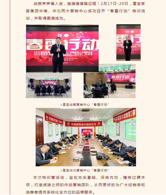 至此,雪寶家居集團(tuán)華南、華北兩大營銷中心“春雷行動(dòng)”特訓(xùn)營圓滿成功結(jié)訓(xùn)!