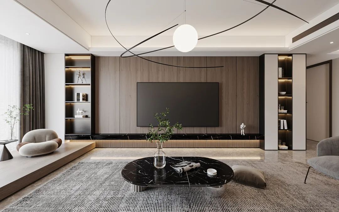 在開放式的空間布局,將空間中的飾面墻、電視柜、展示柜、收納柜等進行有機串聯(lián),鋪設出連貫輕簡而自如的功能氛圍,不同的飾面表現(xiàn)模式穿插其間,塑造出維度豐富、視覺飽滿的一體化系統(tǒng),更將優(yōu)雅與沉穩(wěn)彌散進空間的每個角落。