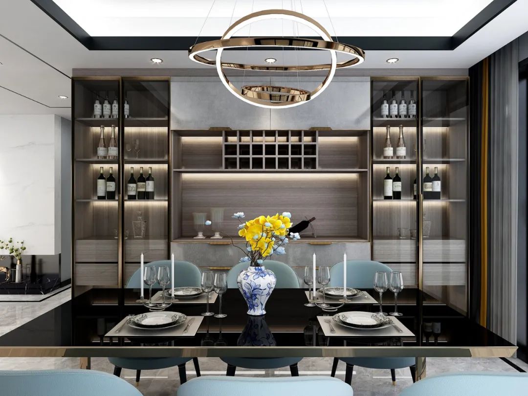 整墻而立的酒柜,收納“一柜”搞定,加入金屬鋁框玻璃門,增添設(shè)計感,獨具品位,視覺上更為通透。