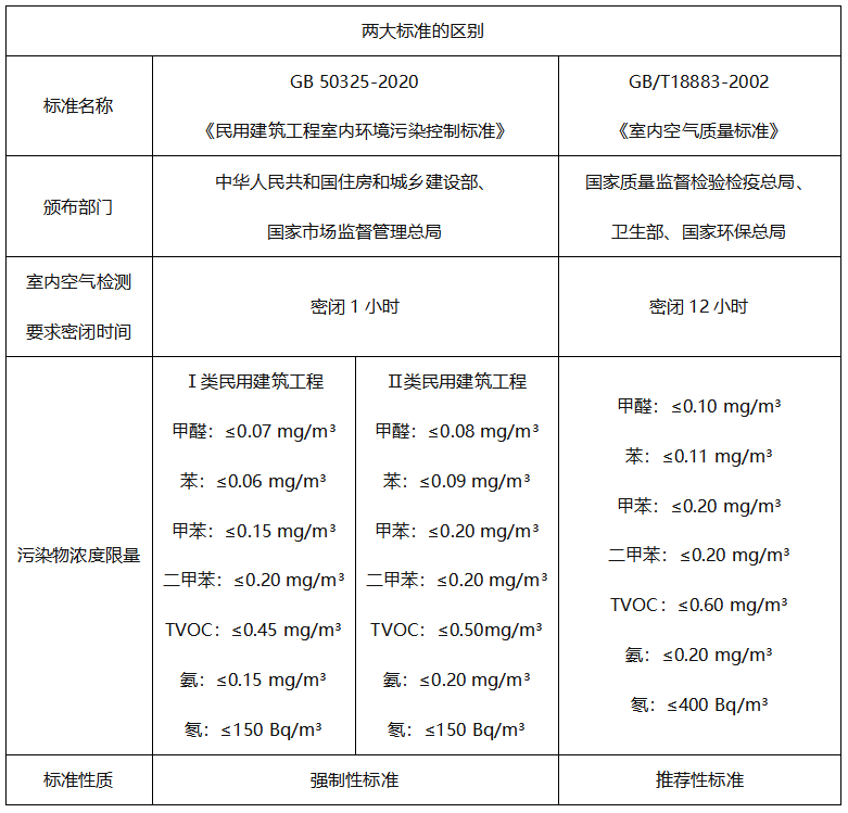 GB/T 18883-2002為國(guó)家推薦性標(biāo)準(zhǔn),檢測(cè)前需至少密閉12小時(shí),為極限環(huán)境下檢測(cè)給出的限值。