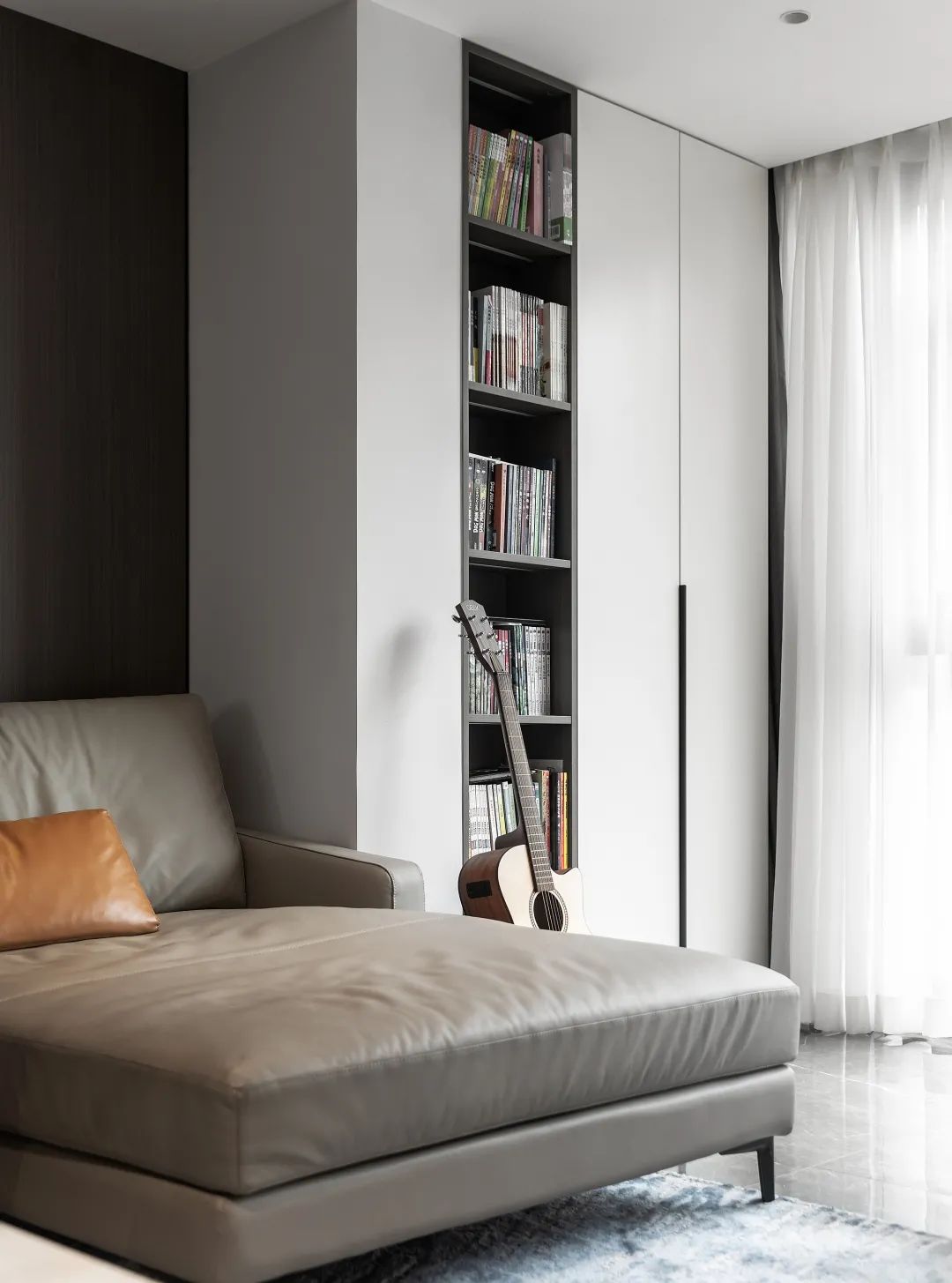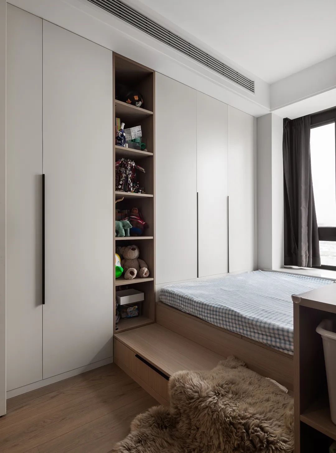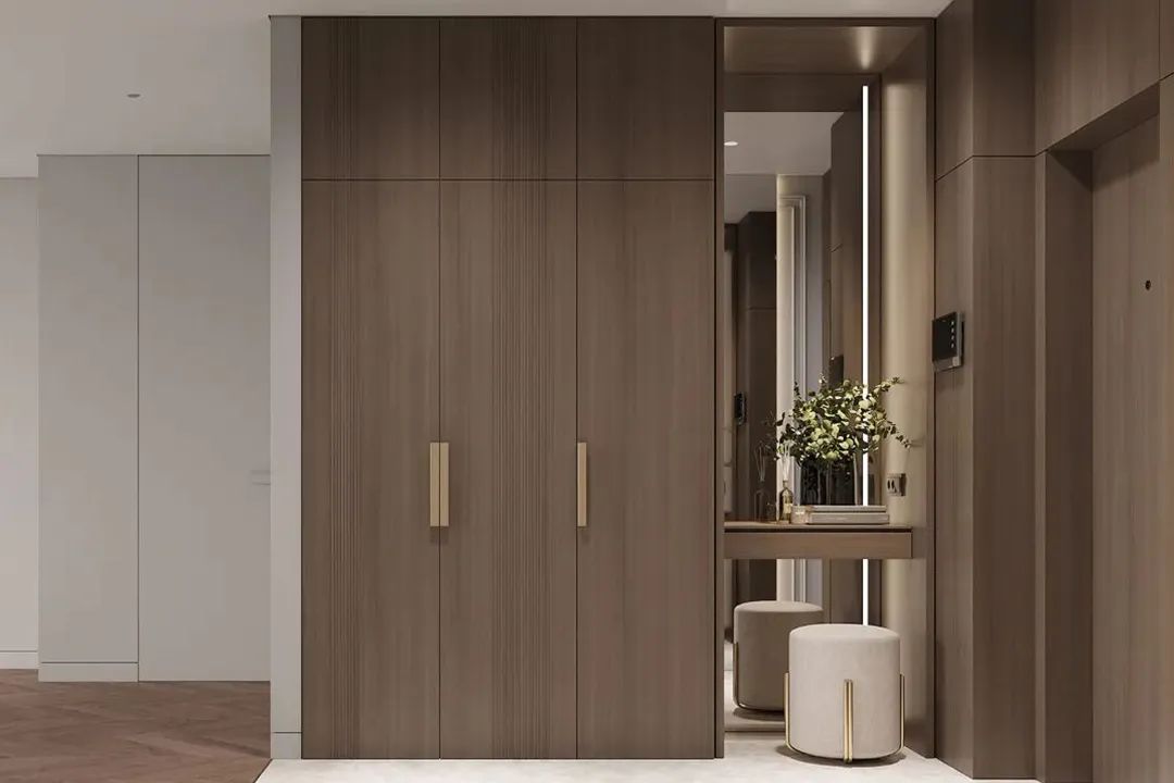 當(dāng)然你還可以做嵌入式滿墻多功能柜,可以是書柜,也可以是衣柜,日常收納游刃有余。