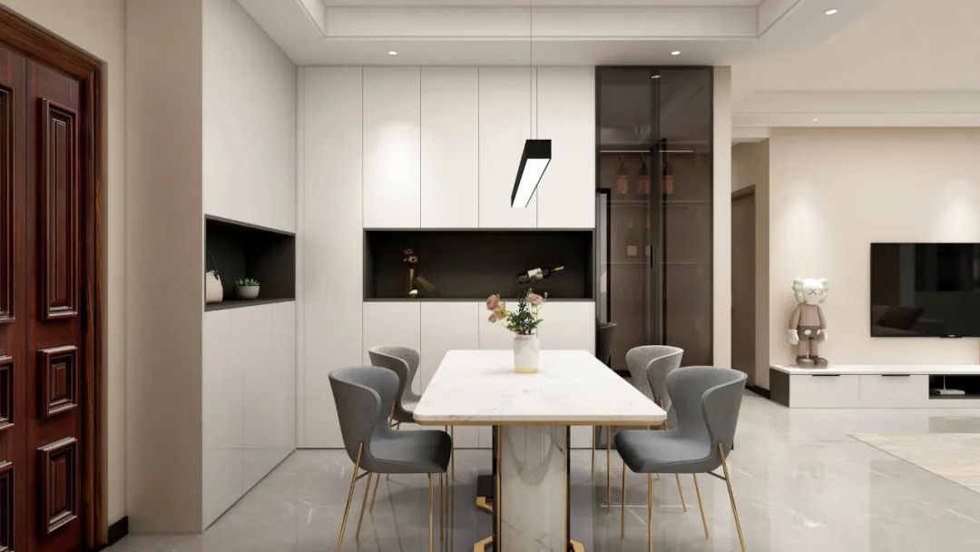 如果覺得客餐廳沒有隔斷,空間區(qū)域劃分不明顯的話,還可以在電視柜與餐邊柜中間設(shè)計(jì)整列開放格或其它方式作為視覺觀感上的區(qū)隔。
