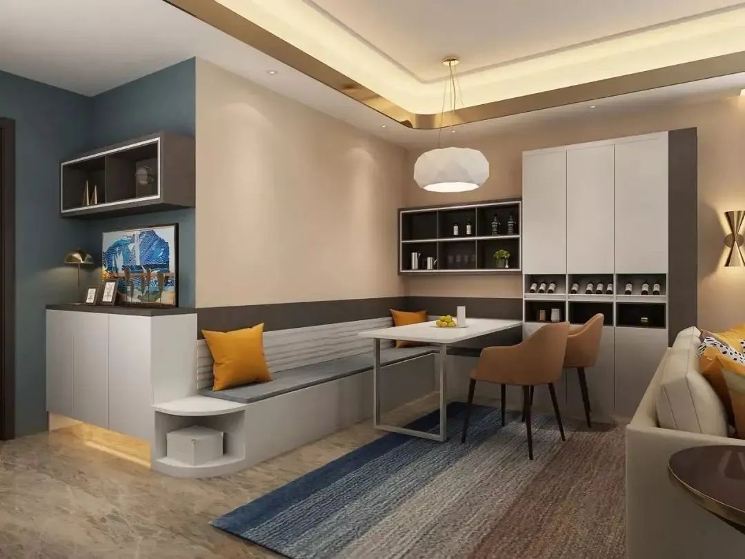 如果餐廳空間比較小的話,還可以在這里貼墻定制卡座來代替餐椅,不僅節(jié)約了椅子的占位,卡座還能用來儲物,進(jìn)一步提高了空間利用率。