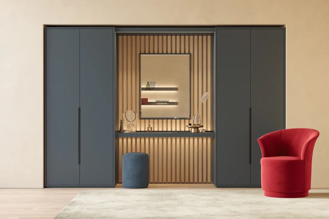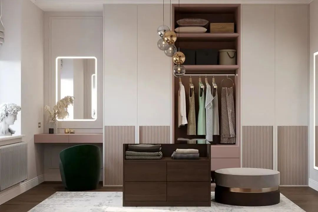 當(dāng)然,除了延展出來,也可以直接把梳妝臺“裝”在衣柜里,做衣柜時提前設(shè)計(jì)好在某一處空出一個空間,定制一個置物格,安裝抽屜,充當(dāng)梳妝臺面,不僅整體性強(qiáng),也更節(jié)省空間。