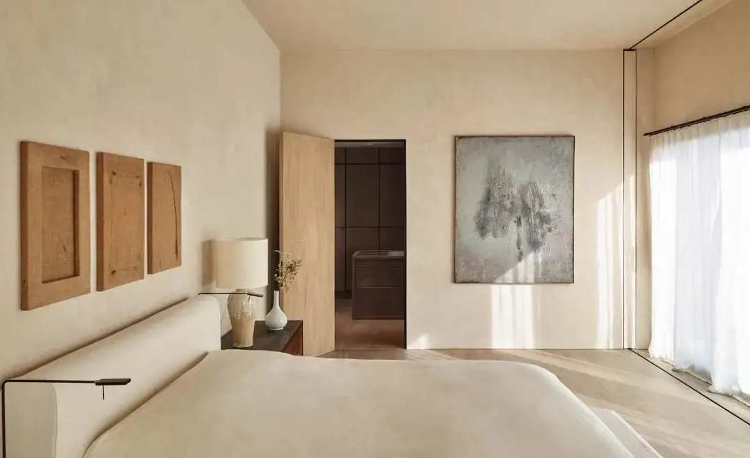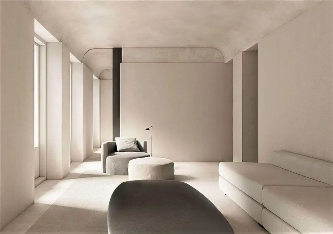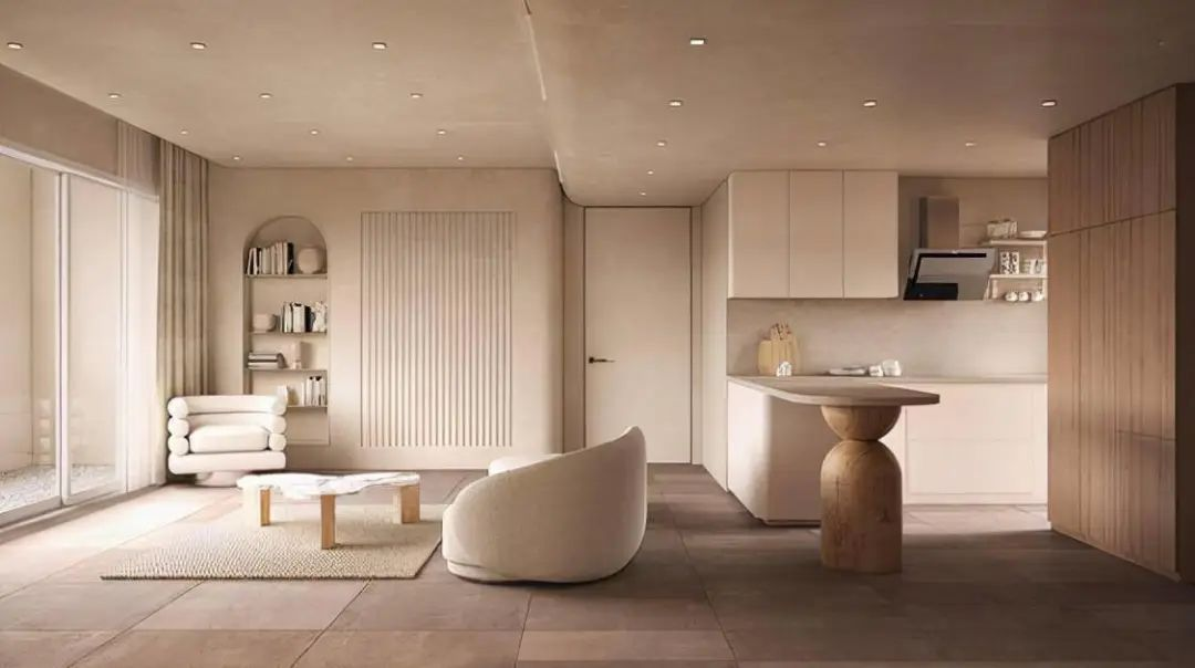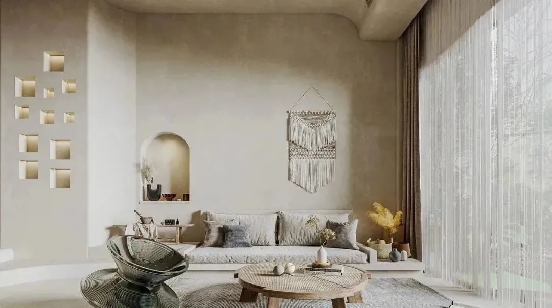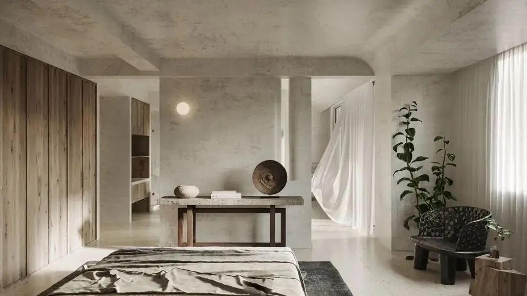 侘寂風(fēng)的設(shè)計(jì),沒有復(fù)雜的裝飾、圖案花紋,墻頂?shù)氐恼w造型盡量簡(jiǎn)潔大方。