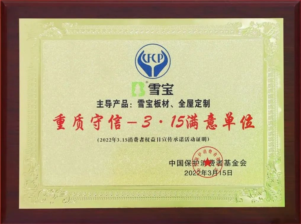 經(jīng)過多輪嚴格的評審與篩選,雪寶家居集團有限公司主導(dǎo)產(chǎn)品雪寶板材、全屋定制品類以優(yōu)異的產(chǎn)品品質(zhì)和良好的消費口碑,被中國保護消費者基金會授予“爭創(chuàng)3•15消費安全品牌承諾單位”!