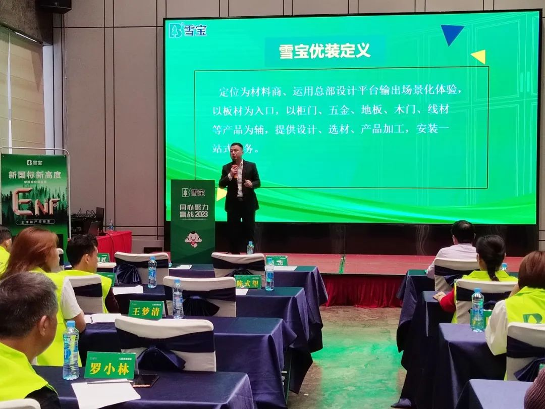 現(xiàn)場,雪寶優(yōu)裝部經(jīng)理譚勤智先生深入解讀《雪寶優(yōu)裝運營》,從優(yōu)裝核心定位、落地“三板斧”等方面直擊核心痛點,強化和詳述了雪寶優(yōu)裝的差異化競爭力,以及優(yōu)裝形象門店定位“材料展廳、體驗式展廳、共享展廳”3大功能展廳剖析優(yōu)裝的利弊關(guān)系和利害影響。同時基于優(yōu)裝“前店后廠”的材料加工中心,以及對比定制更美觀更牢固的二合一無孔工藝和超具效率的交付工期,真正實現(xiàn)了消費者、木工師傅、合作客戶、裝飾公司等渠道的發(fā)展共贏局面。