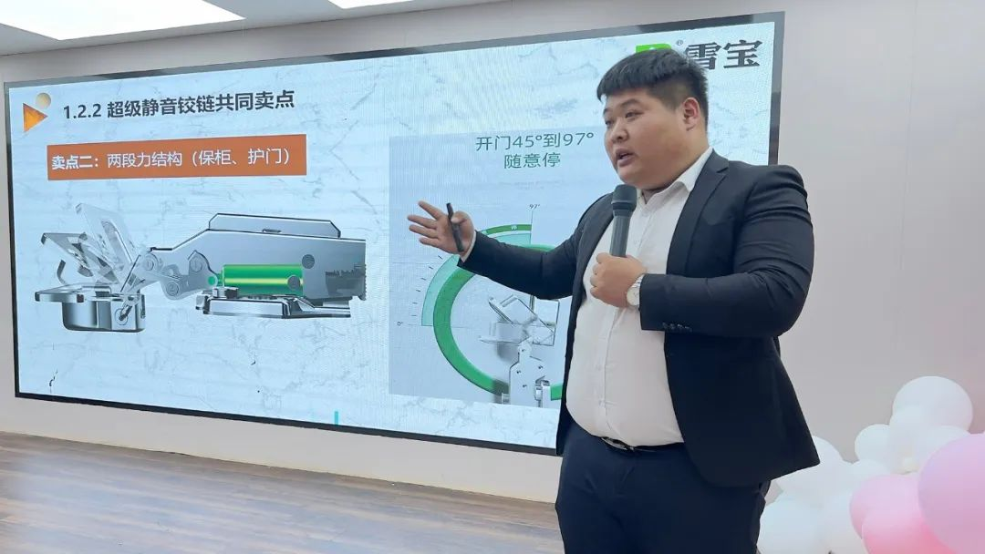 雪寶華北家具板事業(yè)部山東省區(qū)經理趙蘭仕先生現場講解雪寶五金產品知識,從產品研發(fā)、使用性能、生產工藝、營銷設計、產品質檢體驗,以及品牌強大售后服務等多維度展開系統(tǒng)、專業(yè)的介紹,幫助各位合作伙伴在一次的清晰了解雪寶五金的核心差異化優(yōu)勢。