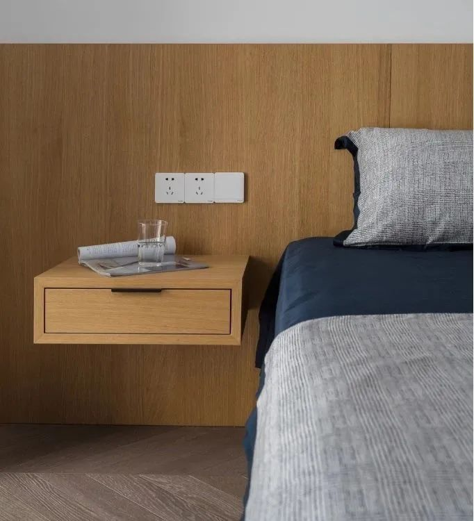 懸空式床頭柜大多與家具連在一起,整體性更強(qiáng)。厚度大于15cm可以擁有抽屜,收納功能也不差哦!