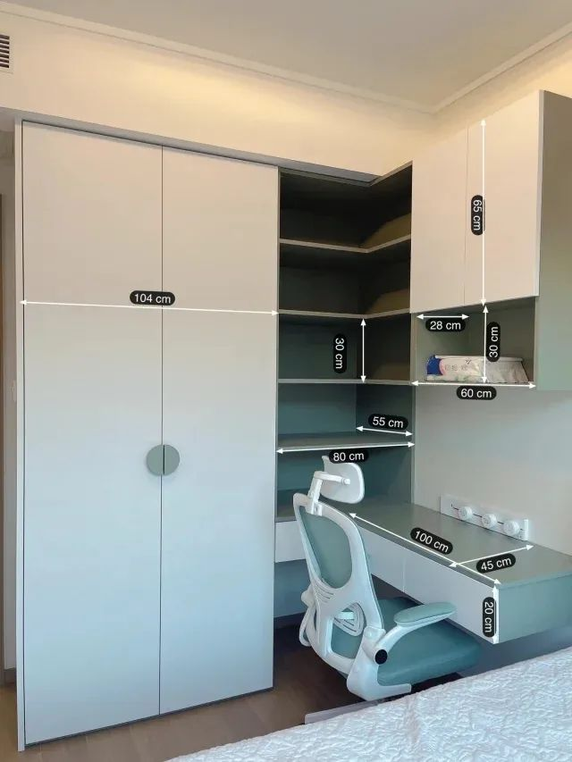 書柜與書桌的功能具有延續(xù)性,將兩者結合,設計成轉角式書桌柜,利用兩個墻面做一體化布局,空間利用更充分,十分適合小臥室。