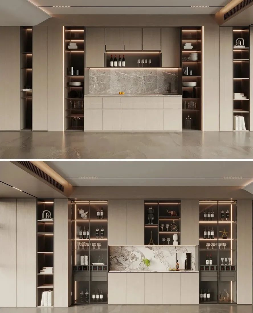當(dāng)餐廳面積太小,又想要做餐邊柜怎么辦?高顏值的嵌入式餐邊柜就是很好的選擇!嵌入式的餐邊柜可以完美地融入整體設(shè)計(jì),輕松擴(kuò)容,避免占用過多的空間,同時(shí)視覺上更為通透和諧,沒有龐然大物的突兀之感。