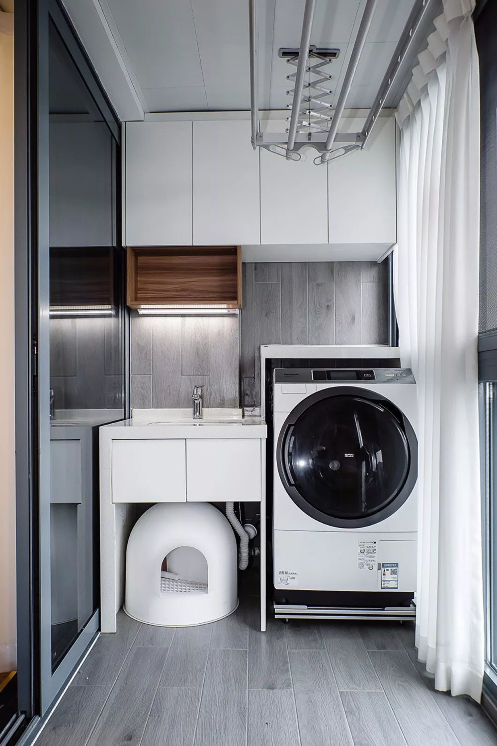 假如手洗衣物不是很多的情況下,備用的洗衣液等物品裝個(gè)吊柜完全能夠滿(mǎn)足收納。