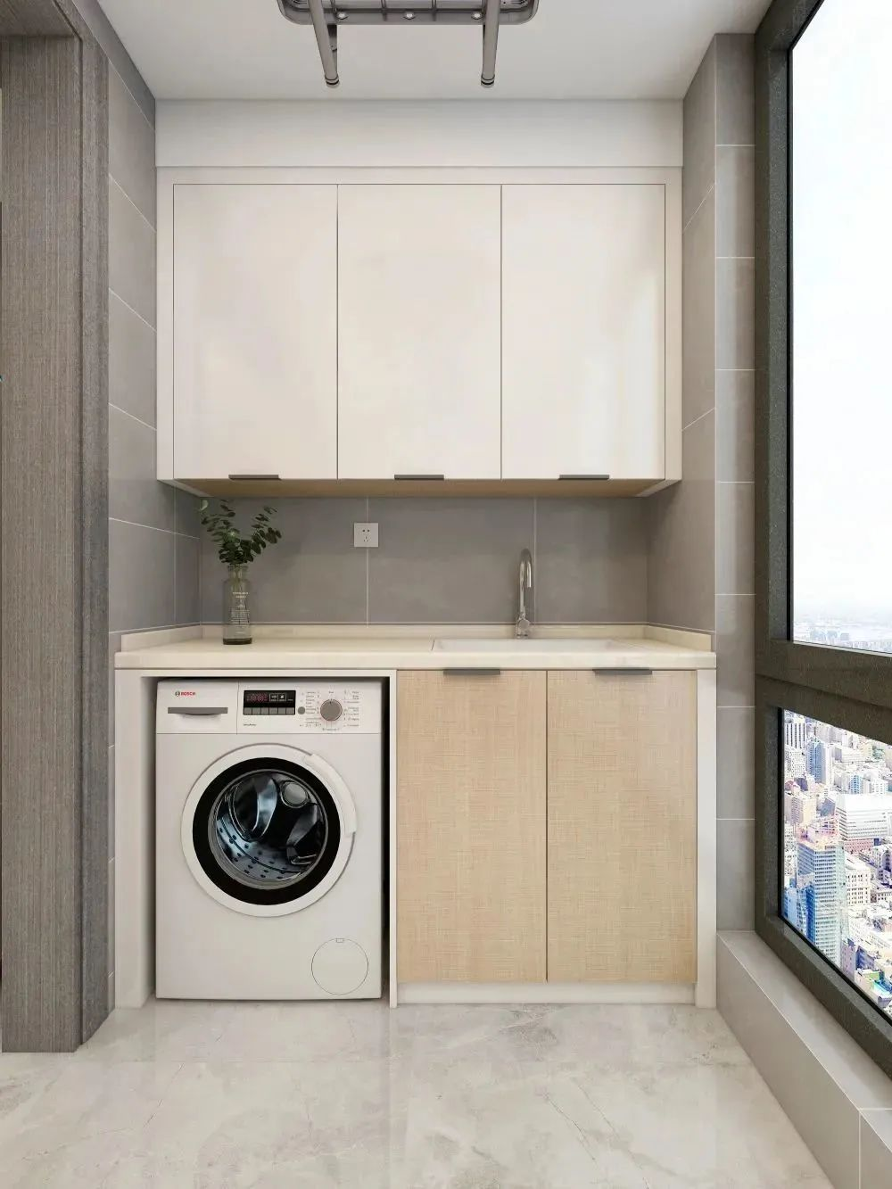 如果能把閑置的陽(yáng)臺(tái)利用起來(lái),定制一個(gè)開(kāi)放式或者是半開(kāi)放式的陽(yáng)臺(tái)柜,多格設(shè)計(jì),要用的和不經(jīng)常用的東西都可以往里面放置,大面積的收納空間把洗衣機(jī)及一切雜亂都藏于柜內(nèi)。如果想要居家時(shí)光也保持美美的氣質(zhì),可以在柜子中間增加一面小巧的梳妝鏡,心情也能變得更好。