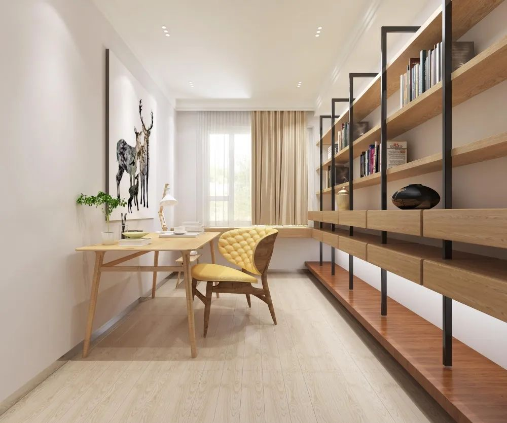 原木色的書房形成了樸素的自然風(fēng)格。質(zhì)樸的原木貫穿全屋,可用低飽和度的白色和綠植進(jìn)行點(diǎn)綴空間,顏色由深到淺,層次感十足。