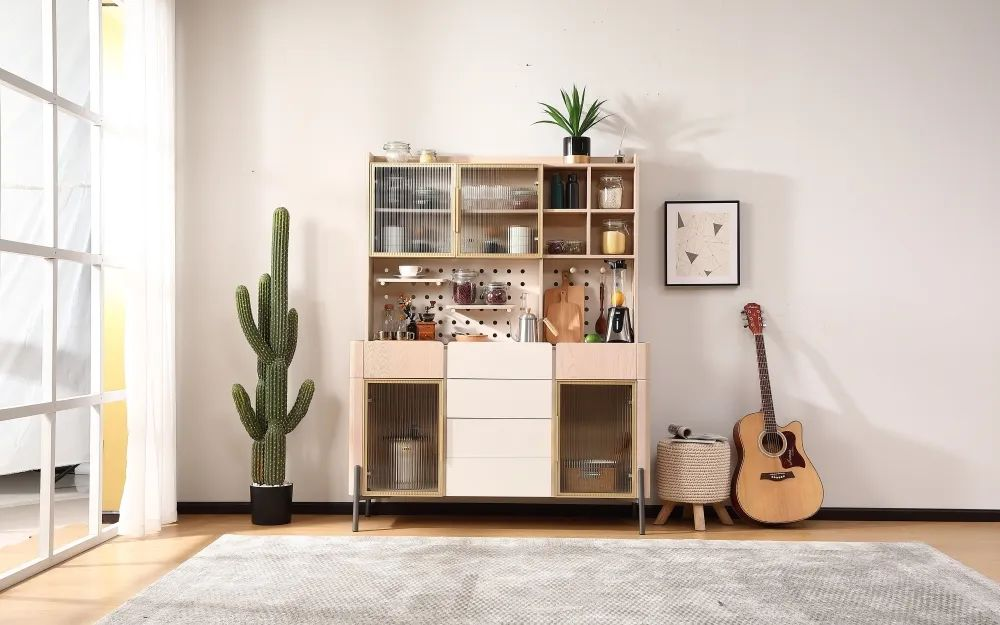 餐邊柜可以提供強大的收納功能,像廚具、餐具、一次性水杯、茶具、零食等等大小物品,都可以收納在餐邊柜里面,避免家里到處都是雜物亂擺的情況。