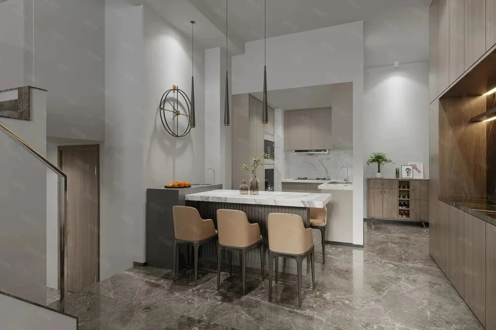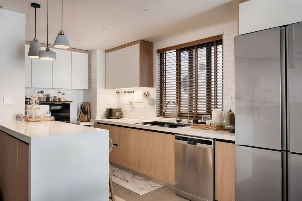 在油煙已經(jīng)不成問題的今天,開放式的廚房采光更足,跟家人溝通也更方便。唯一不好的一點是廚房容易跟客廳混成一塊,總有種在客廳做飯的錯覺。這時,在廚房和客廳之間加入一個吧臺,讓兩者的劃分更明顯,而且吧臺還能當(dāng)備餐桌,一舉兩得。