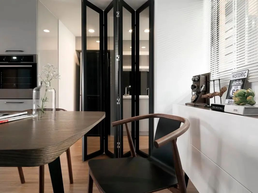 相比普通的平開(kāi)門(mén),折疊門(mén)最大的好處就是可以推移到側(cè)邊,不占地方,活動(dòng)更自由。而且折疊門(mén)關(guān)起時(shí),還可以清晰劃分空間功能,完全打開(kāi)后,又讓兩個(gè)相鄰空間變?yōu)橐粋(gè)整體,空間劃分更加靈活,且有助于空間通透性的塑造。