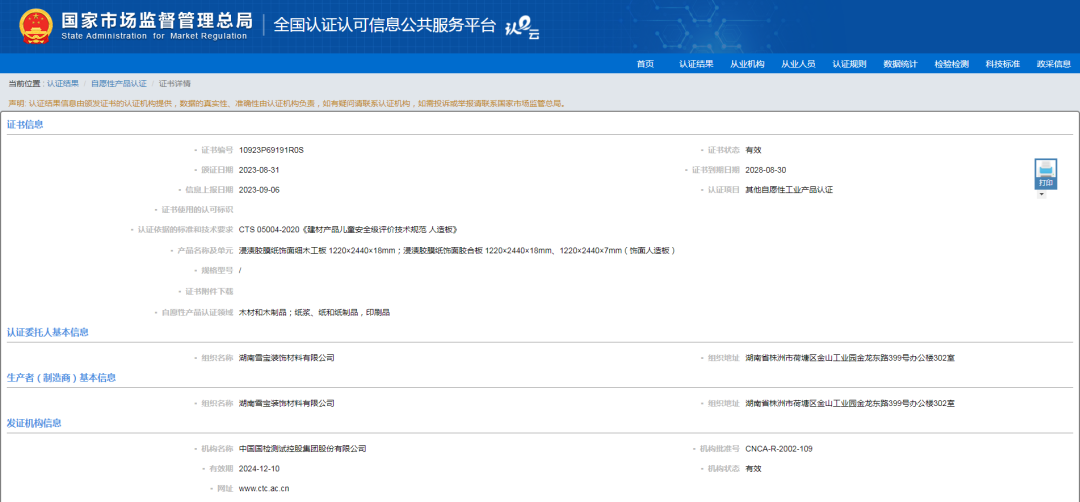 兒童安全級(jí)產(chǎn)品認(rèn)證,以更嚴(yán)苛的環(huán)保標(biāo)準(zhǔn)、更嚴(yán)謹(jǐn)?shù)恼J(rèn)證規(guī)則,旨為保障兒童活動(dòng)場(chǎng)所質(zhì)量及環(huán)境安全健康,也為踐行國家質(zhì)量強(qiáng)國戰(zhàn)略、保證兒童健康生活貢獻(xiàn)力量。本次獲得由中國國檢測(cè)試控股集團(tuán)股份有限公司(CTC)出具的兒童安全級(jí)產(chǎn)品認(rèn)證證書顯示:產(chǎn)品符合 CTS 05004-2020《建材產(chǎn)品兒童安全級(jí)評(píng)價(jià)技術(shù)規(guī)范人造板》的要求,進(jìn)一步有力證明了雪寶板材飾面人造板材系列產(chǎn)品的健康和環(huán)保性,同時(shí),雪寶板材產(chǎn)品環(huán)保性、安全性得到國家官方權(quán)威機(jī)構(gòu)的認(rèn)證,也是對(duì)我們致力拔高行業(yè)的產(chǎn)品環(huán)保水平新高度的認(rèn)可和肯定!