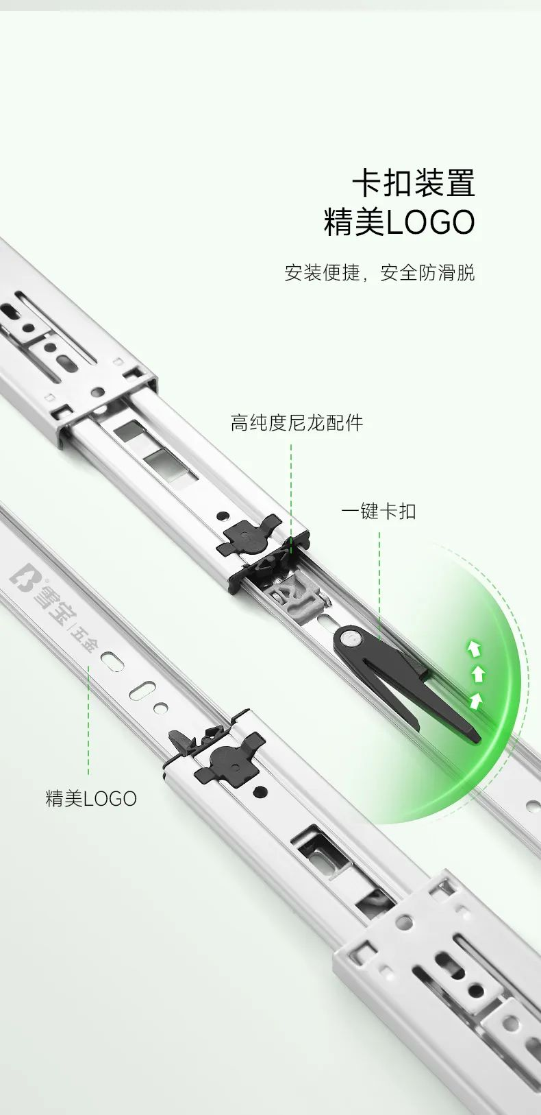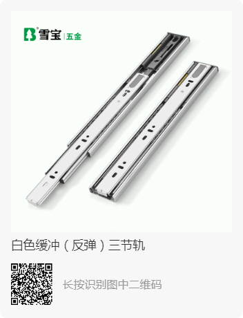 滑軌抽屜在現(xiàn)代家具中是必不可少的組成部分,而在整個抽屜的設(shè)計中,小小的滑軌對整個抽屜的質(zhì)量可有著舉足輕重的影響,那些大大小小的抽屜能否自由順滑地推拉、承重如何,全靠滑軌的支撐。雪寶4515緩沖(反彈)三節(jié)軌→靜默守護居家生活的溫柔時光!