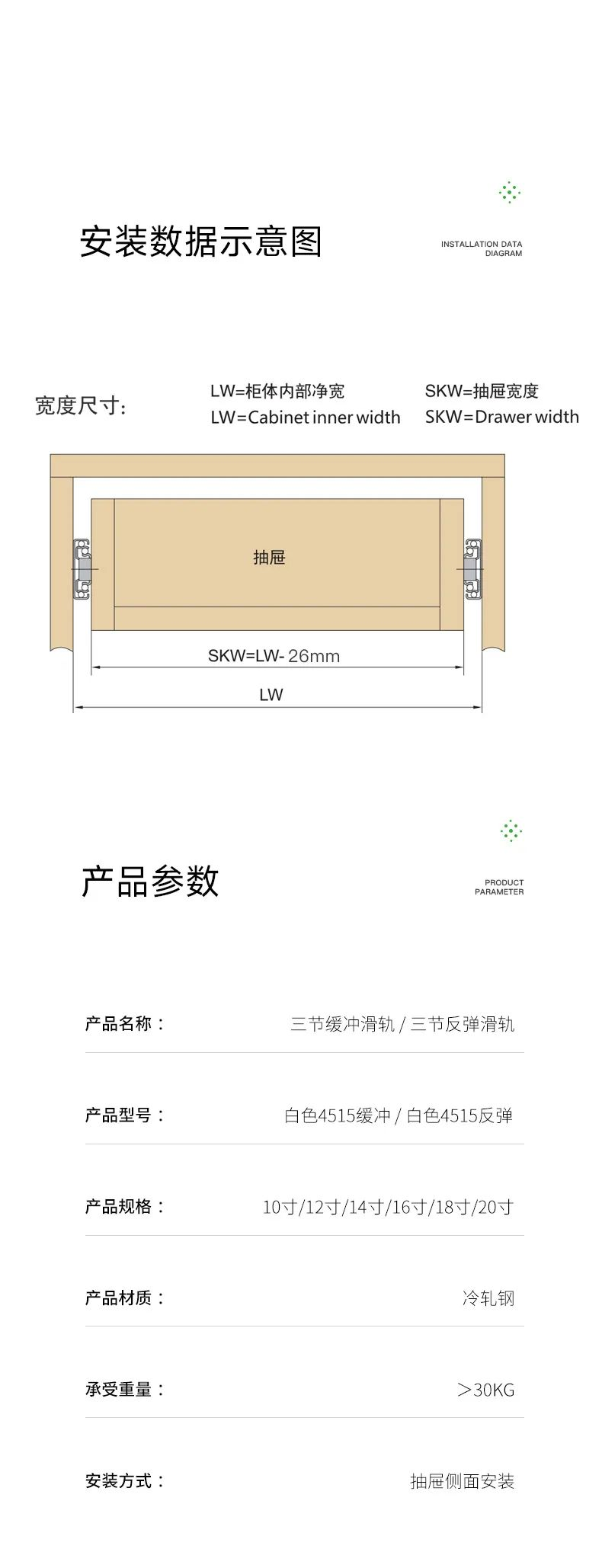 4515緩沖款:緩沖更平穩(wěn)4515反彈款:輕松按彈開啟無論是緩沖款還是反彈款,都具備下述優(yōu)勢:1、上海寶鋼原材料,高光封閉電鍍,抗銹能力極強;2、加厚三節(jié)鋼珠抽屜滑軌,標(biāo)準(zhǔn)厚度,經(jīng)久耐用;3、進口高精圓鋼珠,平穩(wěn)、順暢,開合更靜音;4、三節(jié)軌全拉出,抽屜一覽無余,空間最大化;5、承重30kg,平穩(wěn)堅固;6、防撞膠墊,降噪消音;