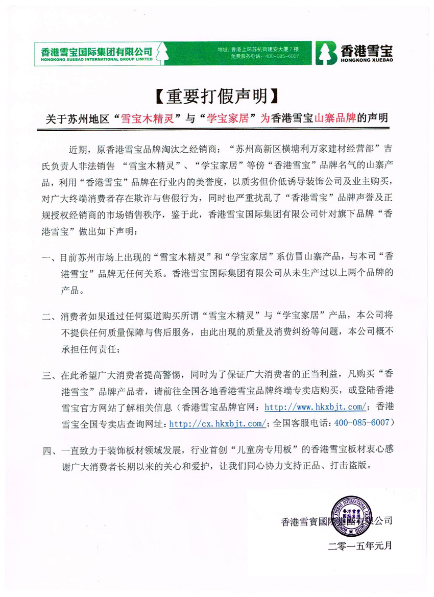 一、目前蘇州市場上出現(xiàn)的“雪寶木精靈”和“學(xué)寶家居”系仿冒山寨產(chǎn)品,與本司“雪寶”品牌無任何關(guān)系。雪寶集團(tuán)有限公司從未生產(chǎn)過以上兩個品牌的產(chǎn)品。