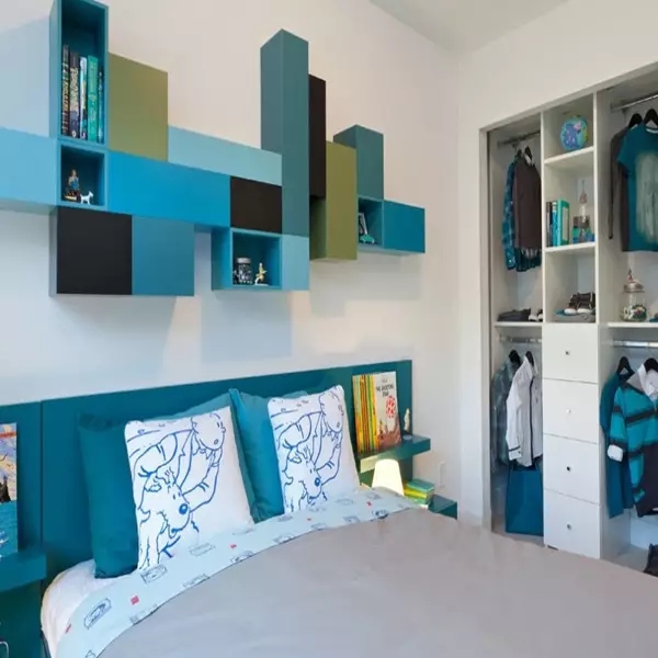 將大小不一的盒子隨意組合,美化墻壁的同時還提高空間的的立體美和層次美。陳列架和柜子相結(jié)合的衣櫥設(shè)計,則充分展現(xiàn)了衣櫥的空間利用率,凸顯空間強大的收納功能。