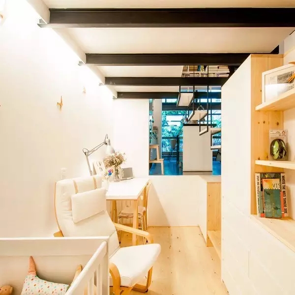 背景墻保留了裝修前的模樣,古舊簡陋的墻壁為角落空間增添了工業(yè)風(fēng)和復(fù)古風(fēng)。儲物柜作為嬰兒房的收納空間,其頂部與地面層持平,成為了走廊空間。因為吊頂足夠高,所以走在上面也不會碰頭。