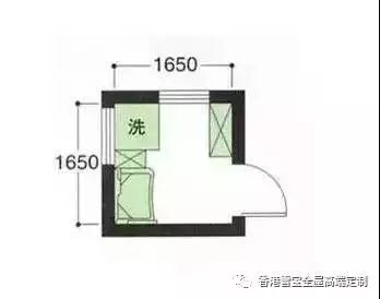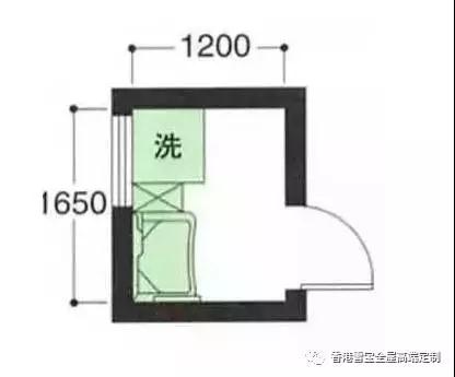 最小尺寸的布局方式,能容納一個(gè)800左右的洗面臺(tái)、收納柜以及洗衣機(jī)。