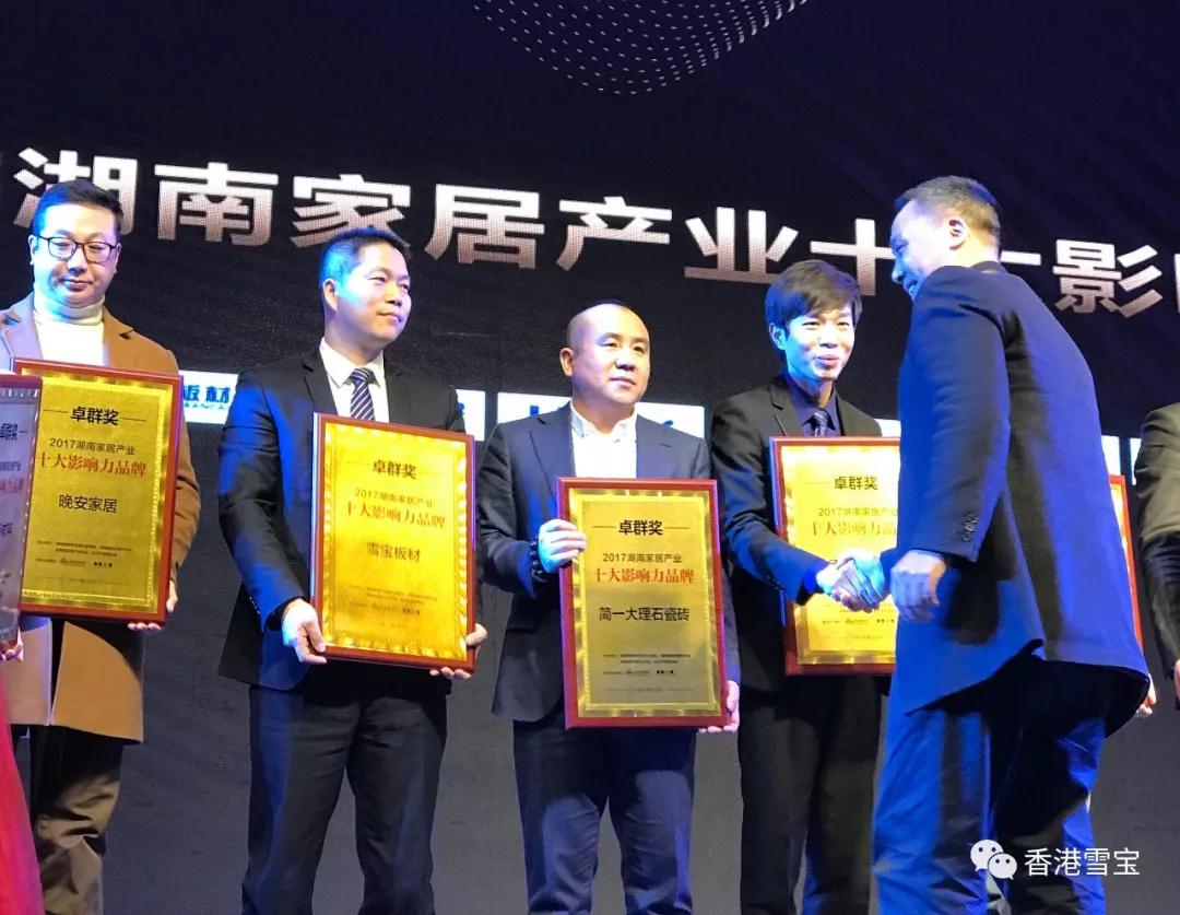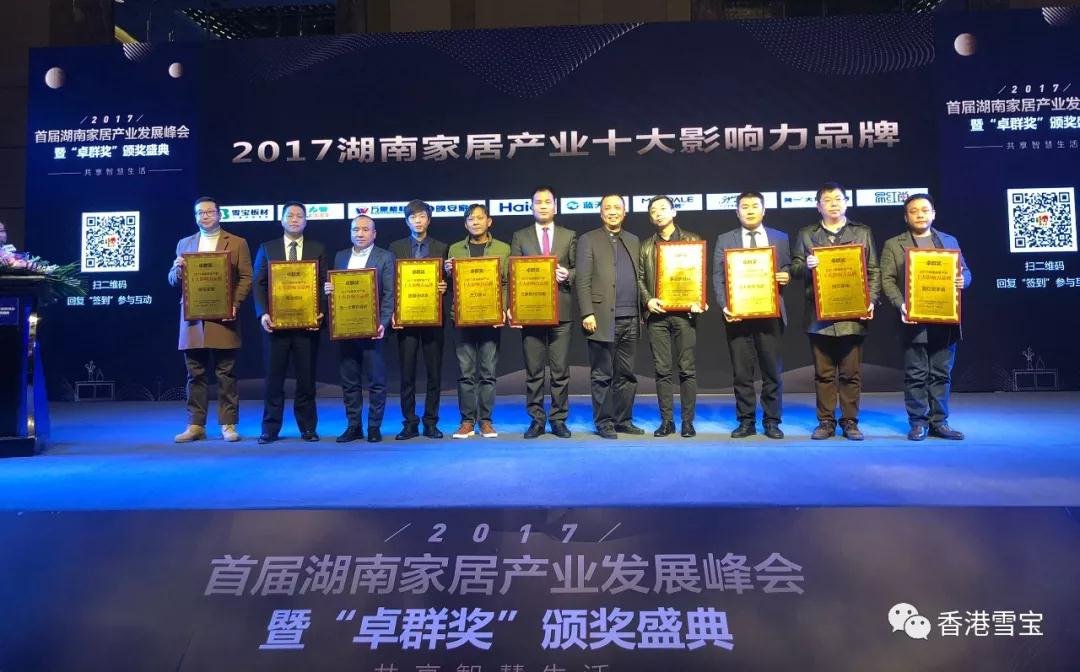 ▲2017年度卓群獎家居產業(yè)十大影響力品牌頒獎,雪寶國內營銷中心熊總(左二)上臺領獎;